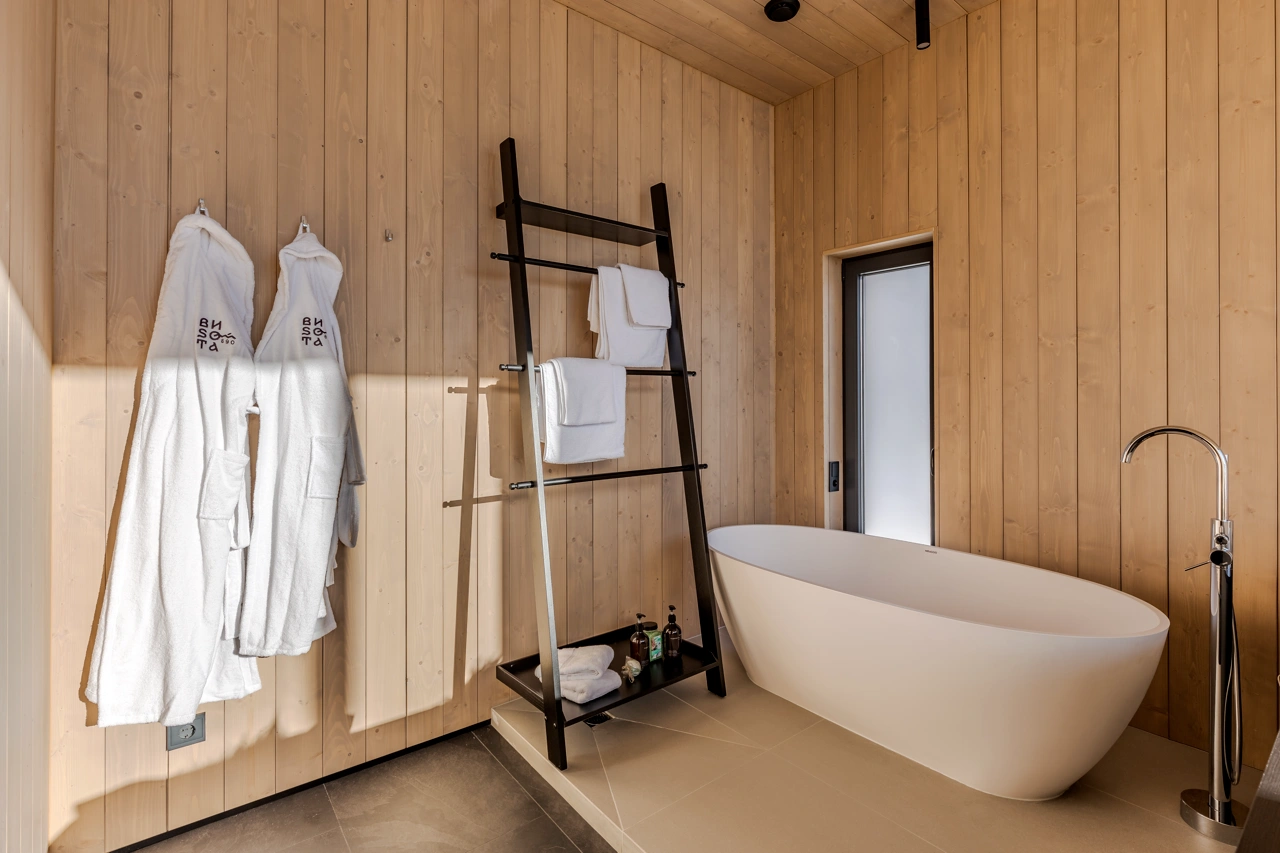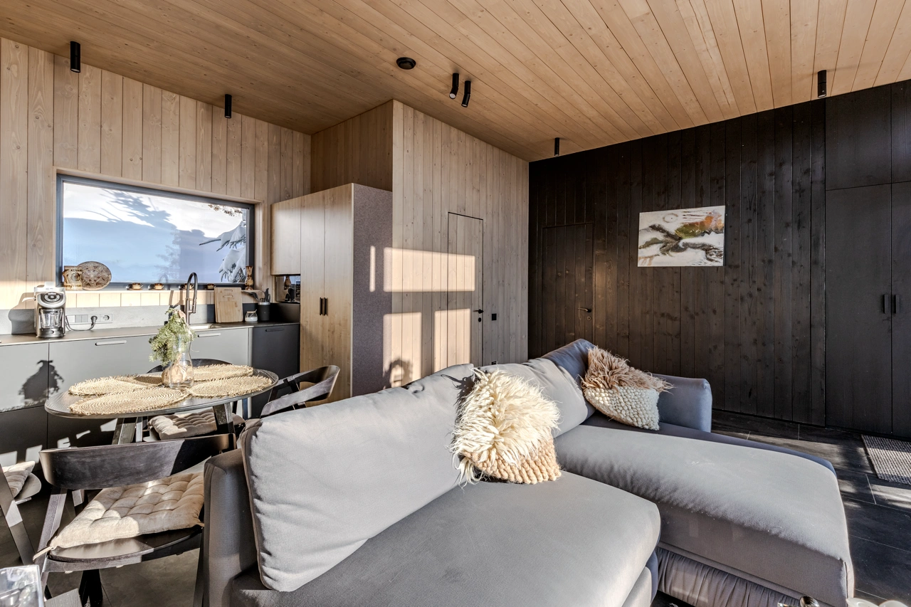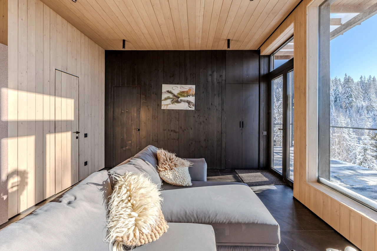 Будинок для двох — або чотирьох, хто хоче бути ближче. Ванна з видом на ліси, камін, вініл, книги й проєктор для затишних вечорів. Кухня — для повільних сніданків і розмов.